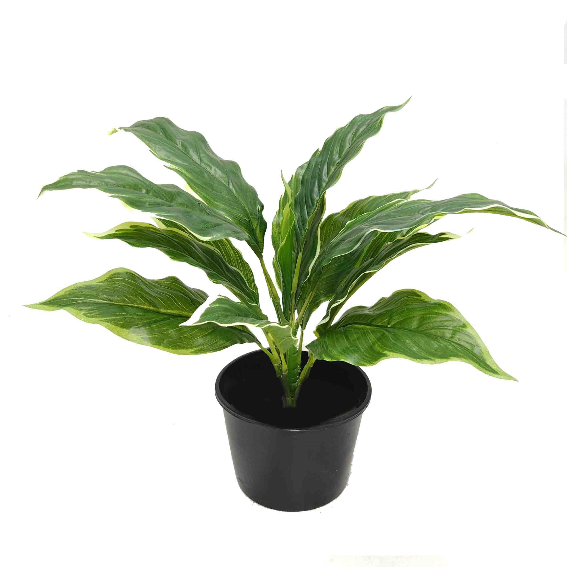 Artificial Variegated Hosta Plant 40cm with Real Touch UV Resistant Leaves in a basic black pot.